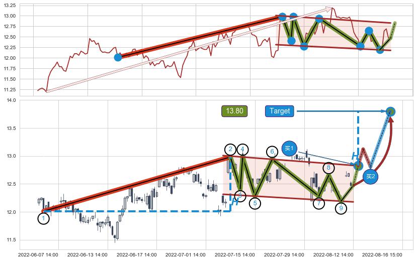 ➢ 【仅预测突破】最后价格:12.47与预测突破价格:12.83→【空间临近】后续最小【整理】第一目标价格→(08-16:15: 13.80 )