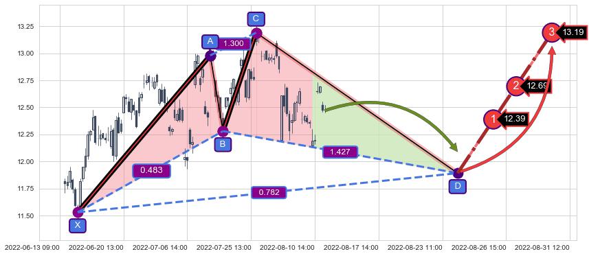 ➣ 未完成【赛福】形态起点X: 06-14:11, 已到达C点: 07-26:13, 预测最终D点: 08-24:10, 共145交易小时