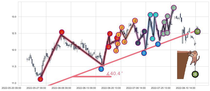 ✂️ 2022-05-25 10:00-2022-08-03 13:00上升趋势存在反转[风险],虽然原上升趋势的支撑位(12.61)已破位,但其支撑效果尚存,原上升趋势角度: 40.4˚