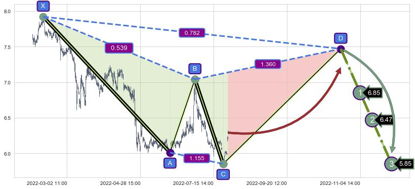 ➢ 距离预测D点位置尚有上涨空间,短线依然【看涨】, 耐心等待看跌【赛福】形态反转启动