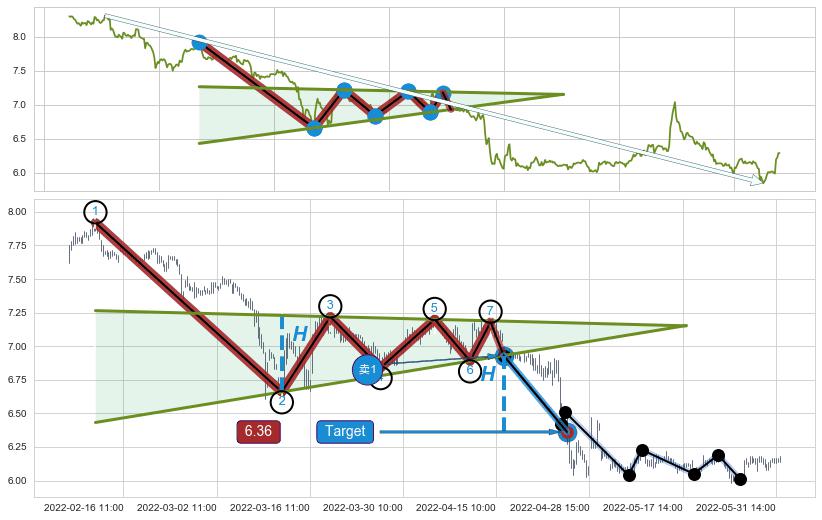 ➣ D点拟合预测价格7.47,距离最后交易收盘价格6.29相差 +18.74%