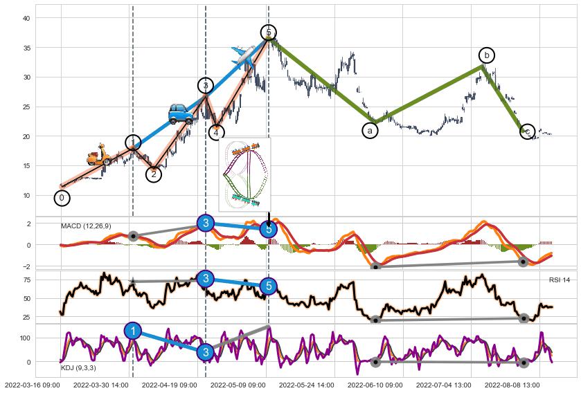 ➣ 1,3,5驱动浪MACD, RSI, KDJ走势都出现【常规背离】反转信号增强