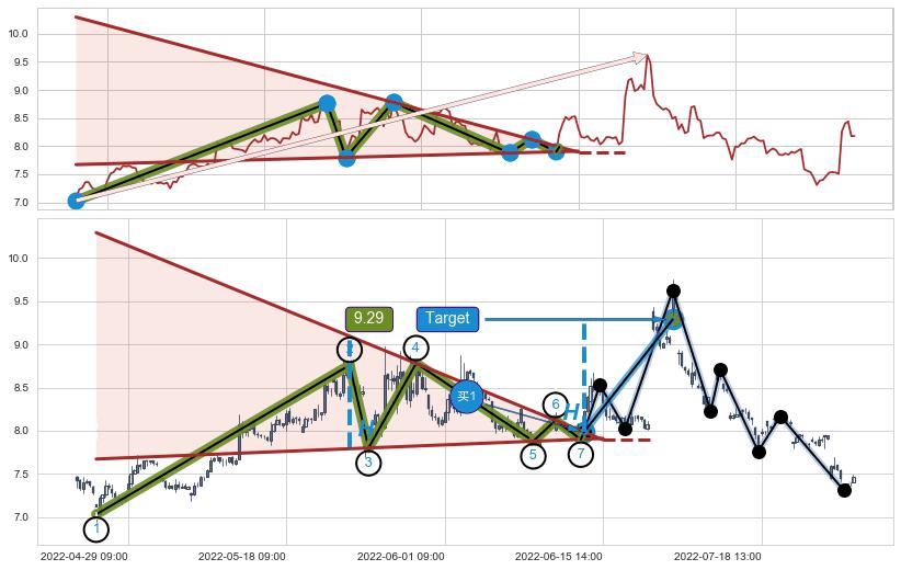 ➢ 【买1】: 激进型 买点 →(06-14:13: 7.98 )形成突破上升【对称】三角形整理【整理】形态