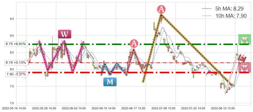 ♘ 阻力价格位8.75,可信任强度91.18%,距离最后交易2022-08-12 14:00形成的收盘价格8.18相差 +6.91%