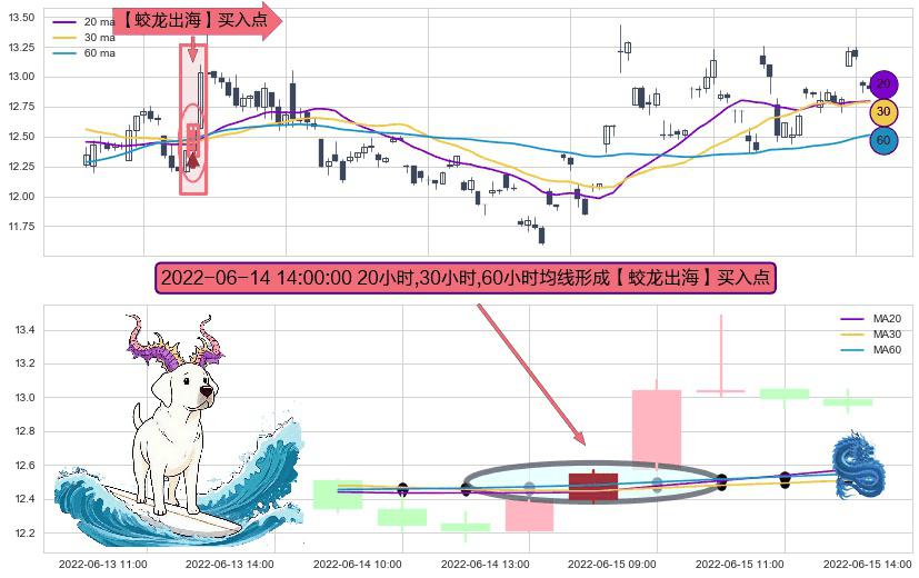 ⚀ 2022-06-14 14:00:00小时显现 20小时-30小时-60小时均线 【蛟龙出海】买入点 看多信号,后市看涨,买入