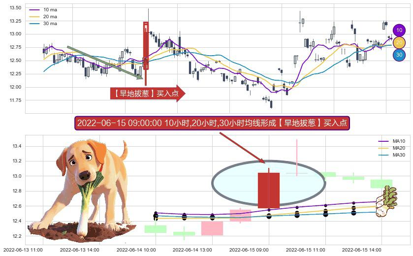 ⚀ 2022-06-15 09:00:00小时显现 10小时-20小时-30小时均线 【旱地拔葱】买入点 看多信号,后市看涨,买入