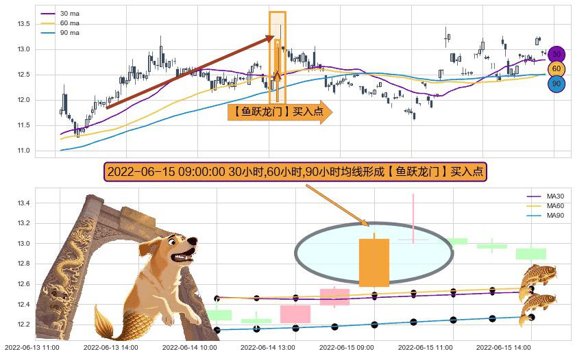 ⚀ 2022-06-15 09:00:00小时显现 30小时-60小时-90小时均线 【鱼跃龙门】买入点 看多信号,后市看涨,买入