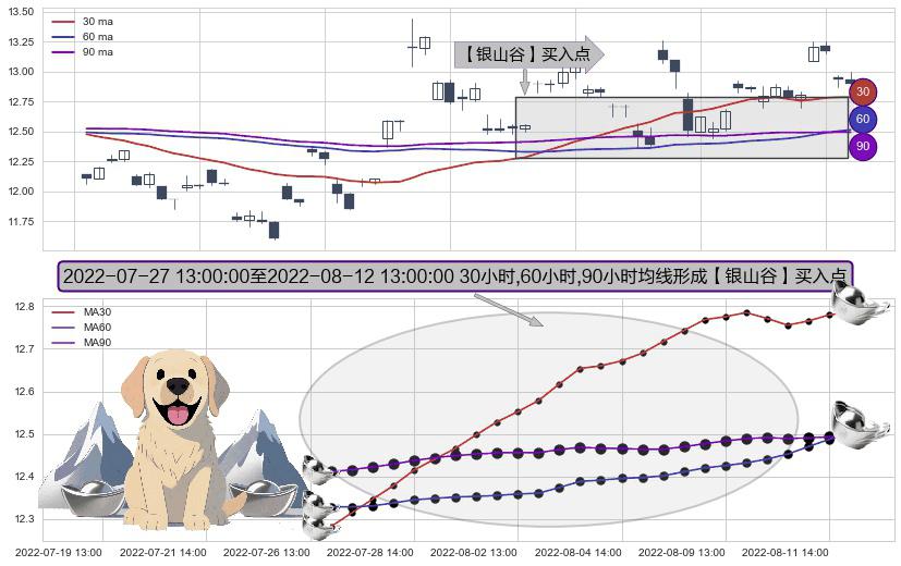 ⚀ 2022-07-27 14:00:00-小时至2022-08-12 13:00:00-小时显现 30小时-60小时-90小时均线 【银山谷】买入点 看多信号,后市看涨,买入