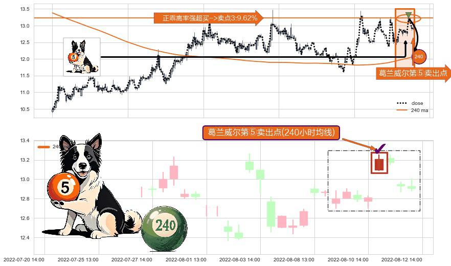 ⚀ 2022-08-11 13:00:00-小时显现 葛兰威尔均线 240小时均线 第⑤卖出点 上升趋势均值回复的短线回落信号,后市看跌,卖出信号