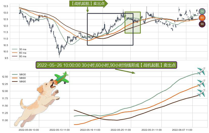 ⚀ 2022-05-16 09:00:00小时-2022-06-08 10:00:00小时显现 30小时-60小时-90小时均线 【战机起航】卖出点 看空信号,后市看跌,卖出