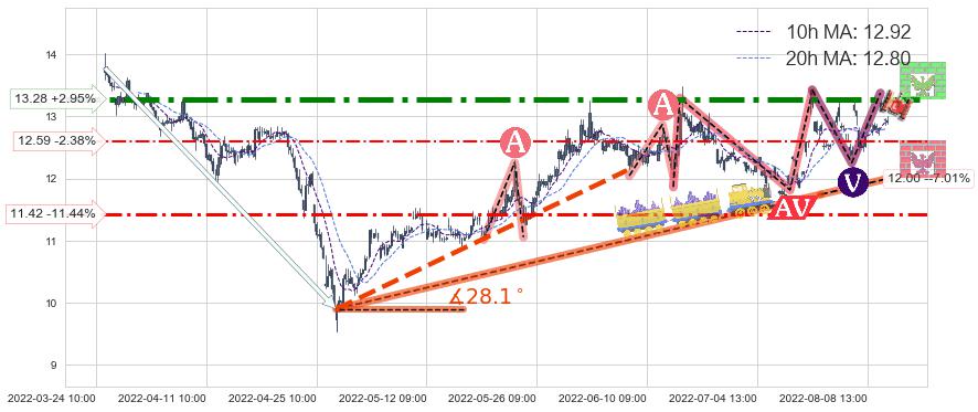 ♘ 阻力价格位13.28,可信任强度94.40%,距离最后交易2022-08-12 14:00形成的收盘价格12.90相差 +2.95%