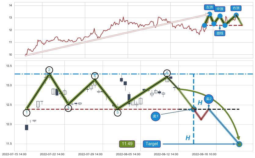 ➣ 【未确认突破,预测即将形成突破】三重顶起点:07-12:14, 预测突破点:08-15:11,形态共51交易小时