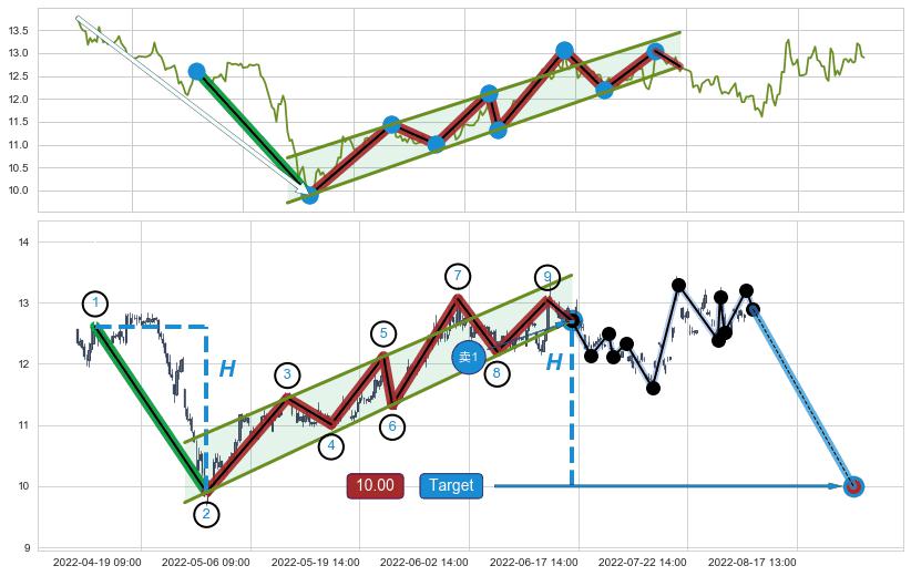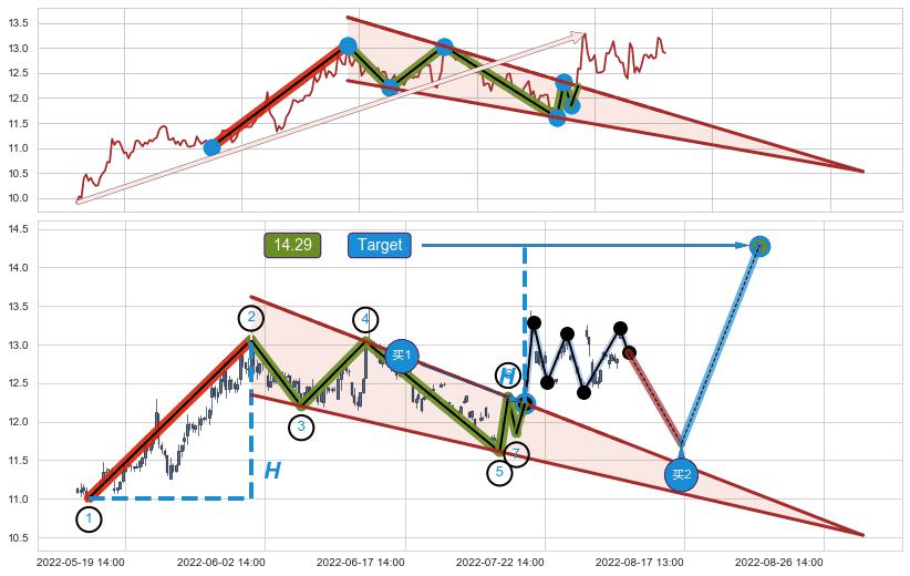 ➢ 最小中继整理涨幅→𝐇: 2.050 (𝐇楔型旗杆的长度:楔型起点→顶点)