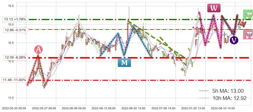 ♘ 阻力价格位13.13,可信任强度84.23%,距离最后交易2022-08-12 14:00形成的收盘价格12.90相差 +1.78%