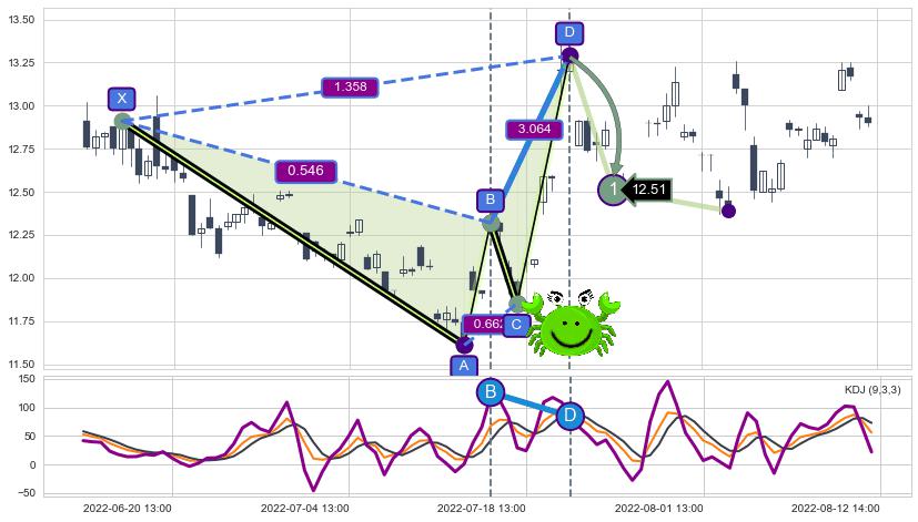 ➢ 已完成【螃蟹】形态起点X: 06-16:14, 终点D: 07-20:14, 共52交易小时