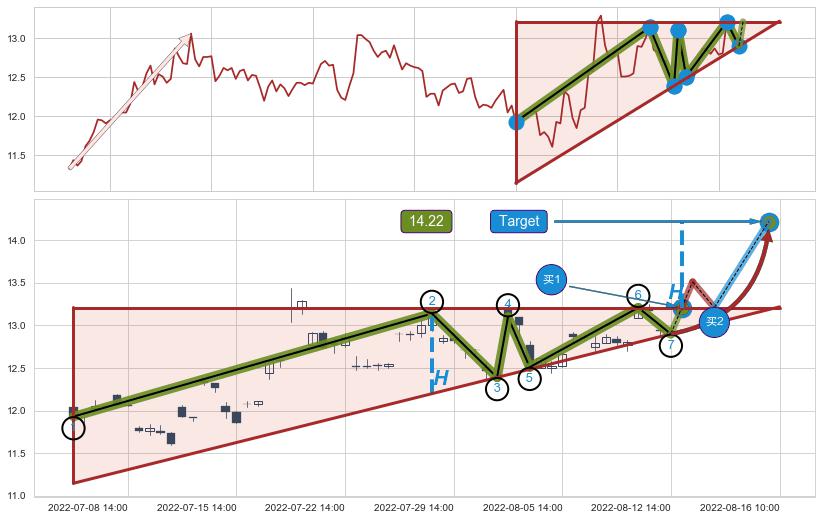 从2022-07-12 14:00至2022-07-20 14:00,共包含13个小时,阶段股价上涨13.86%,阶段股价变动位移路程比: 1 : 1.6,2022-07-20 13:00向⇪形成缺口,跳空上涨+4.93%