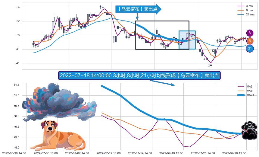 ⚀ 2022-07-08 14:00:00小时-2022-07-26 13:00:00小时显现 3小时-8小时-21小时均线 【乌云密布】卖出点 看空信号,后市看跌,卖出