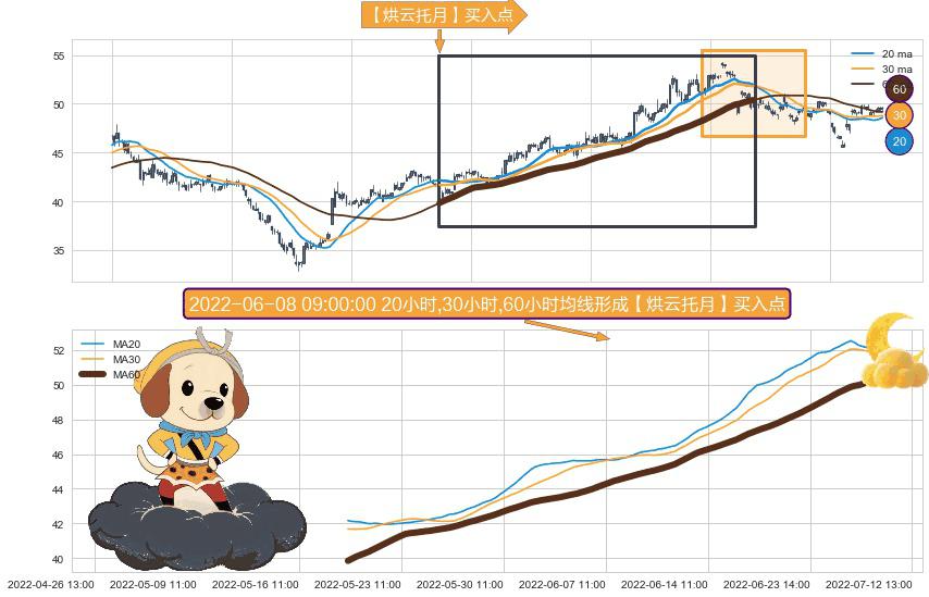 ⚀ 2022-05-18 14:00:00小时-2022-07-06 14:00:00小时显现 20小时-30小时-60小时均线 【烘云托月】买入点 看多信号,后市看涨,买入