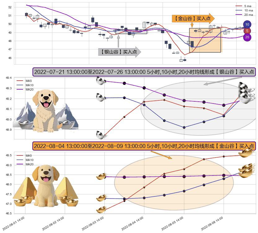 ⚃ 2022-08-04 14:00:00-小时至2022-08-09 13:00:00-小时显现 5小时-10小时-20小时均线 【金山谷】买入点 其再次确认了买入信号,可靠性更强,买入