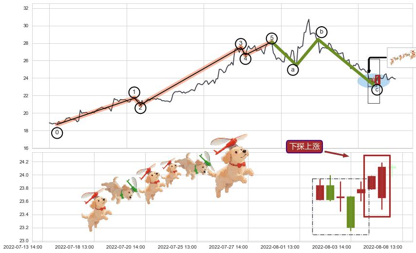 ➢ 高点影线(07-14:13: 28.43 )→再次回踩→第一根k线低点(07-08:14: 28.40 )