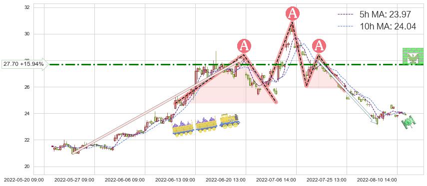 2022-06-15: 第一阻力位27.70强力阻拦了上升趋势,成功阻止了价格的继续上涨。