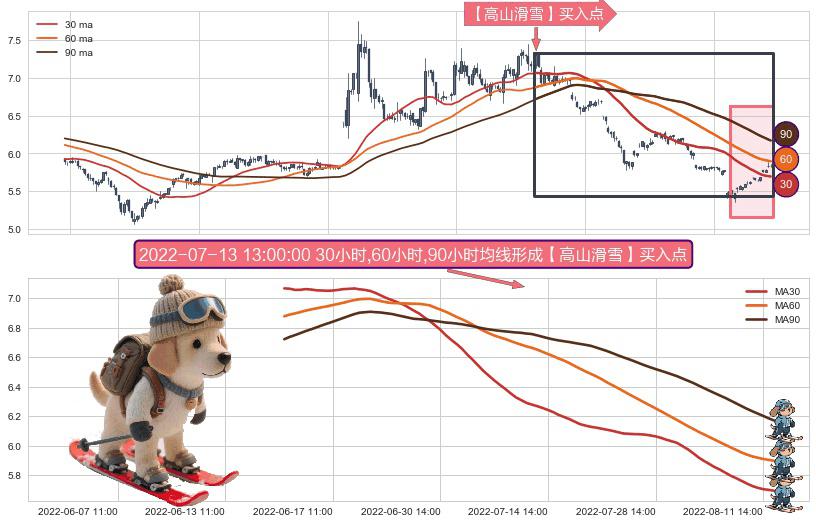 ⚀ 2022-06-15 13:00:00小时-2022-08-12 14:00:00小时显现 30小时-60小时-90小时均线 【高山滑雪】买入点 看多信号,后市看涨,买入
