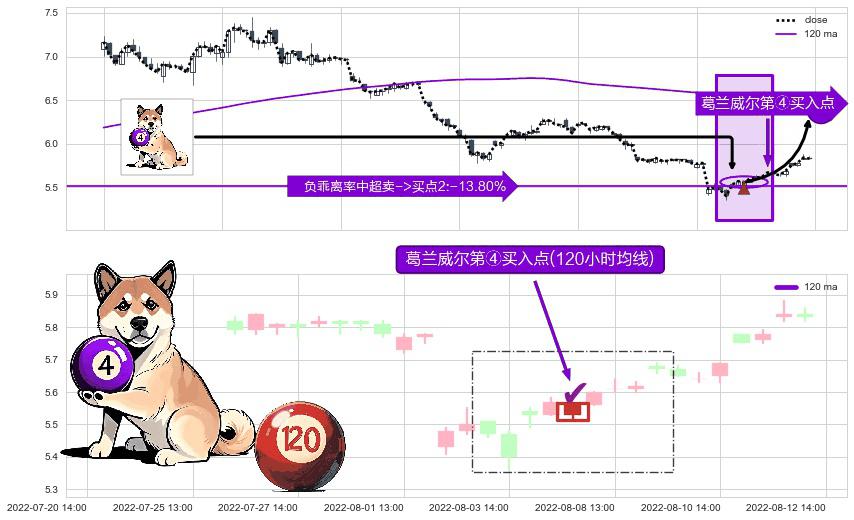 ⚀ 2022-08-05 13:00:00-小时显现 葛兰威尔均线 120小时均线 第④买入点 下降趋势均值回复的短线反弹信号,后市看涨,买进信号