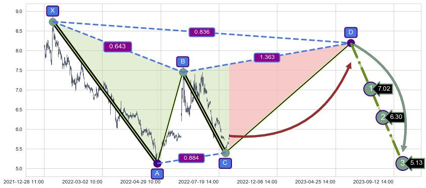 ➣ D点拟合预测价格8.19,距离最后交易收盘价格5.83相差 +40.54%