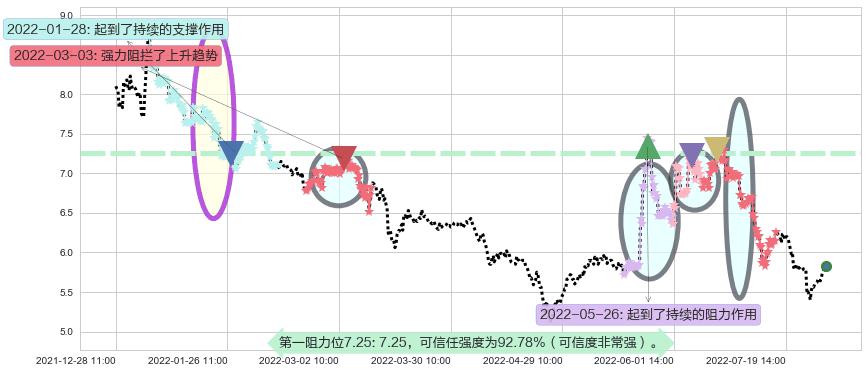 ♘ 阻力价格位7.25,可信任强度92.78%,距离最后交易2022-08-12 14:00形成的收盘价格5.83相差 +24.43%