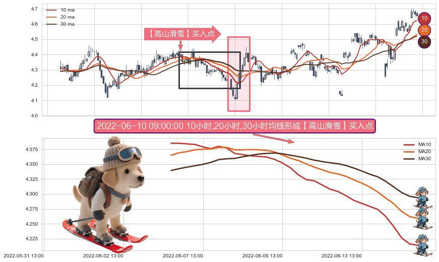⚀ 2022-06-06 14:00:00小时-2022-06-14 14:00:00小时显现 10小时-20小时-30小时均线 【高山滑雪】买入点 看多信号,后市看涨,买入