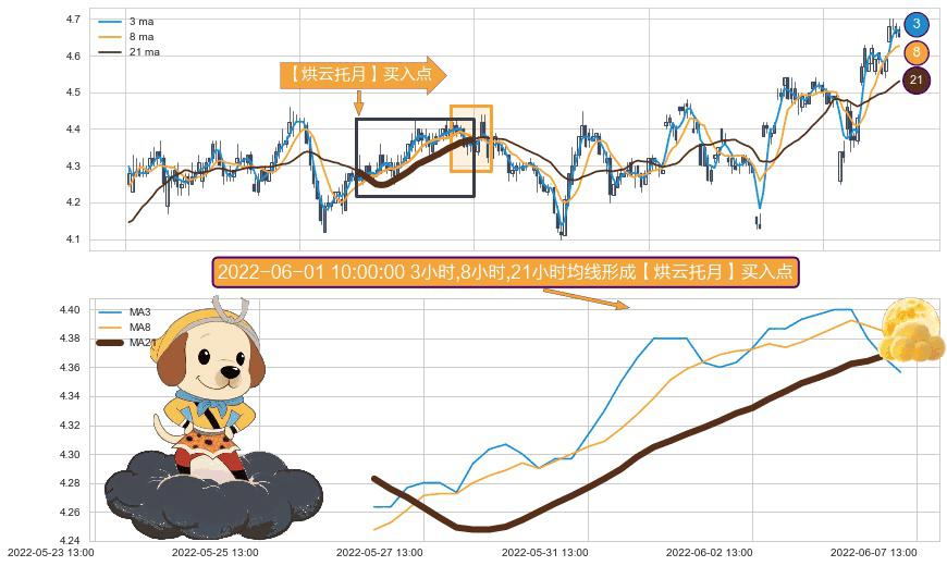 ⚀ 2022-05-27 09:00:00小时-2022-06-07 11:00:00小时显现 3小时-8小时-21小时均线 【烘云托月】买入点 看多信号,后市看涨,买入