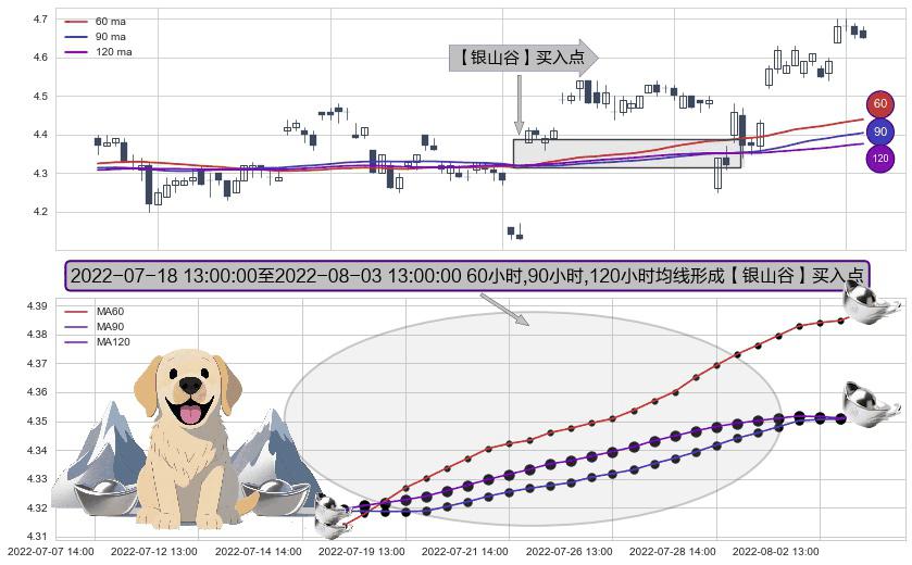 ⚀ 2022-07-18 14:00:00-小时至2022-08-03 13:00:00-小时显现 60小时-90小时-120小时均线 【银山谷】买入点 看多信号,后市看涨,买入