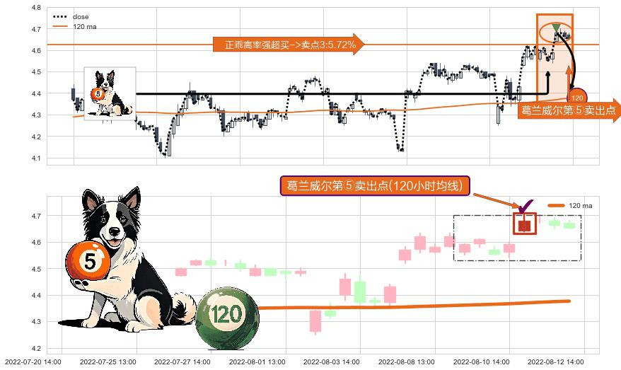 ⚀ 2022-08-11 13:00:00-小时显现 葛兰威尔均线 120小时均线 第⑤卖出点 上升趋势均值回复的短线回落信号,后市看跌,卖出信号