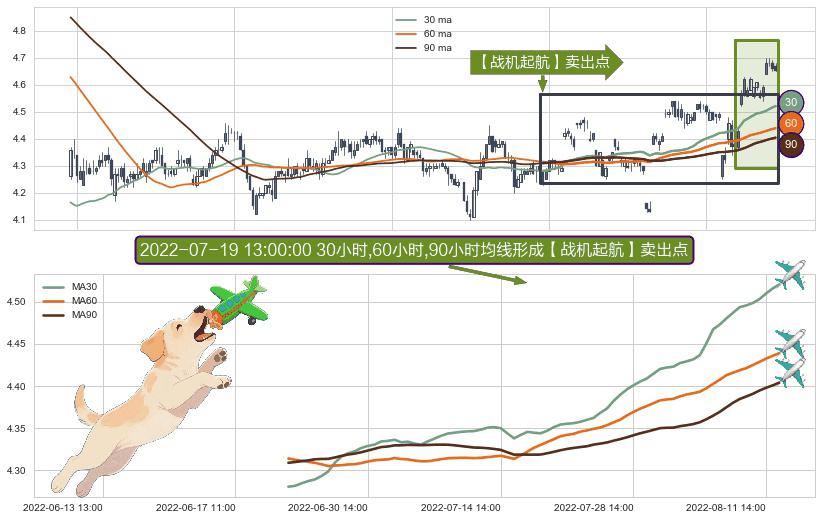 ⚀ 2022-06-22 14:00:00小时-2022-08-12 14:00:00小时显现 30小时-60小时-90小时均线 【战机起航】卖出点 看空信号,后市看跌,卖出