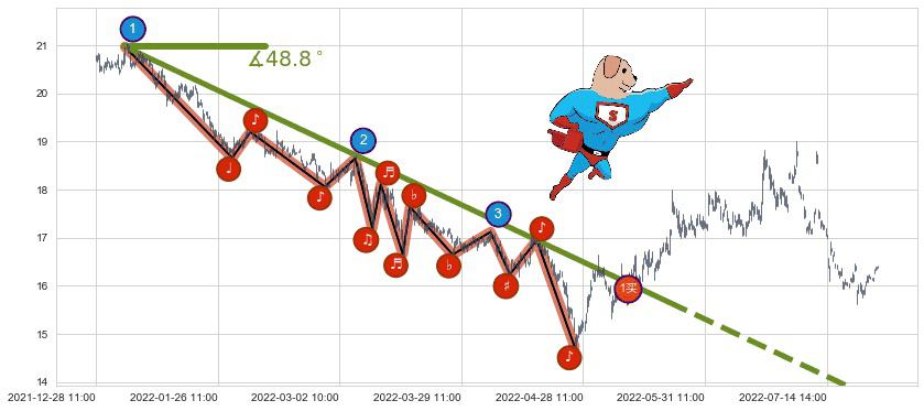 ⚔️ 2022-01-05 10:00-2022-05-23 11:00下跌趋势存在反转上涨[机会],其原下跌趋势的阻力位(13.62)已被突破[强支撑信号],原下跌趋势角度: 48.8˚