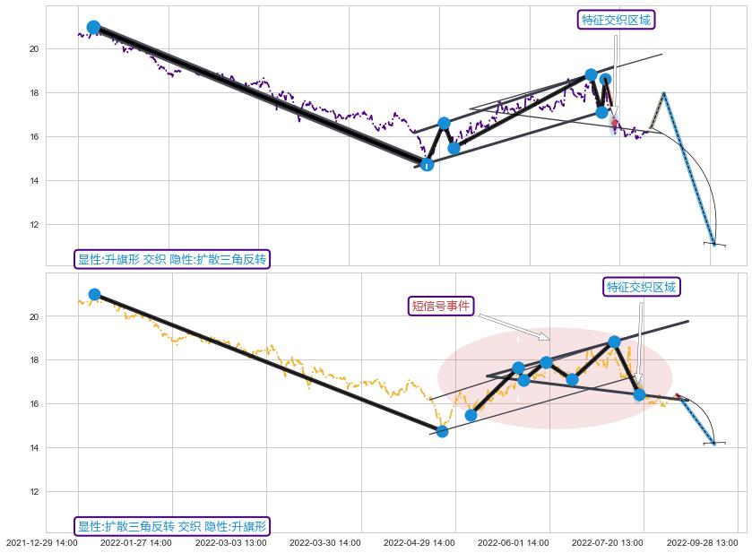 | 2 🅚:【死亡谷】卖出点 ➕ 📐:扩散三角反转下行突破支撑位破位, 猜想持续下沉下跌,被突破的支撑位已变为阻力位 ☞ 看空信号 ⇥ 【均线】交织【图形】⇥ 综合量化分数: 31 | > |