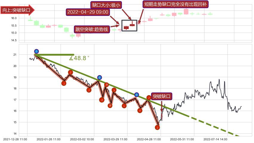 从2022-01-05 10:00至2022-05-23 11:00,共包含447个小时,阶段股价下跌-21.76%,阶段股价变动位移路程比: 1 : 10,下跌趋势角度: 48.8