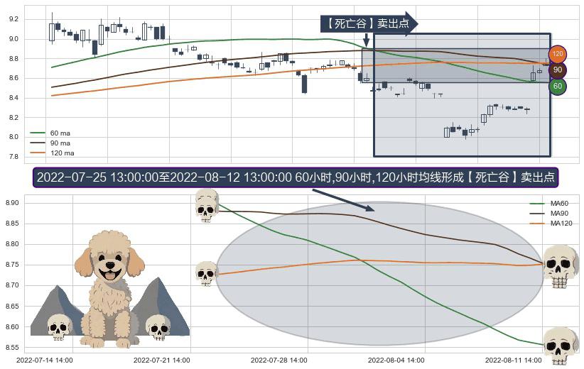 形态多维评估: ⚀ 2022-07-25 14:00:00-小时至2022-08-12 13:00:00-小时显现 60小时-90小时-120小时均线 【死亡谷】卖出点 看空信号,后市看跌,卖出