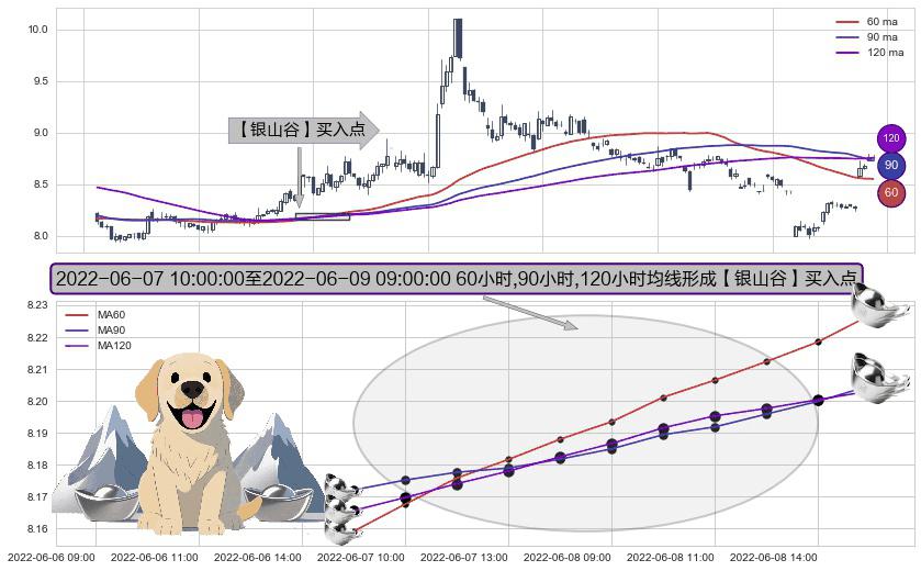 形态多维评估: ⚀ 2022-06-07 11:00:00-小时至2022-06-09 09:00:00-小时显现 60小时-90小时-120小时均线 【银山谷】买入点 看多信号,后市看涨,买入