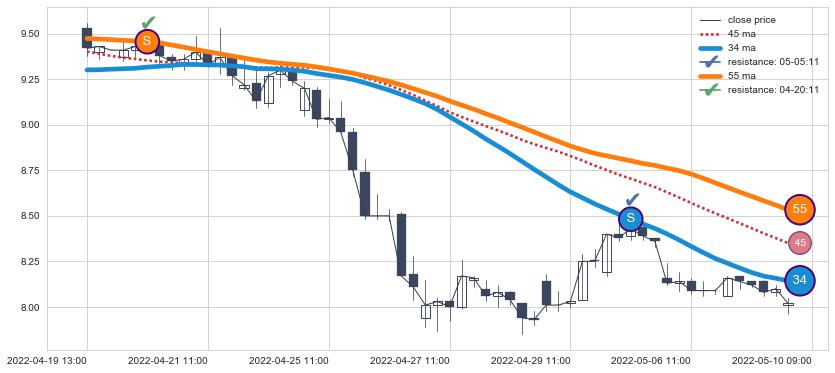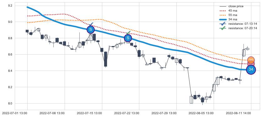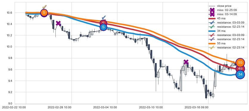下跌趋势02-22 10:00-03-18 11:00,均线34, 45, 55确认关键阻力2处