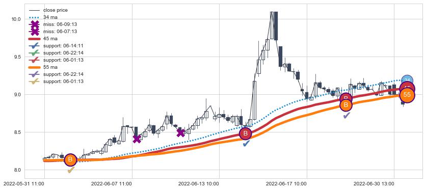 上涨趋势05-31 11:00-07-01 13:00,均线45, 55确认关键支撑3处