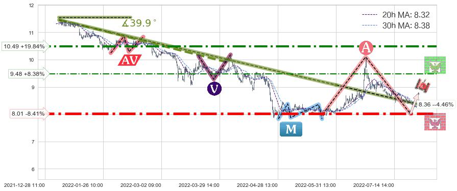 ➣ 2022-01-05 10:00-2022-05-31 13:00下跌趋势存在反转上涨[机会],其原下跌趋势的阻力位(8.36)已被突破[强支撑信号],原下跌趋势角度: 39.9˚