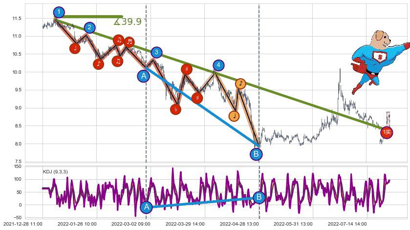 从2022-01-05 10:00至2022-05-31 13:00,共包含477个小时,阶段股价下跌-32.36%,阶段股价变动位移路程比: 1 : 7,下跌趋势角度: 39.9