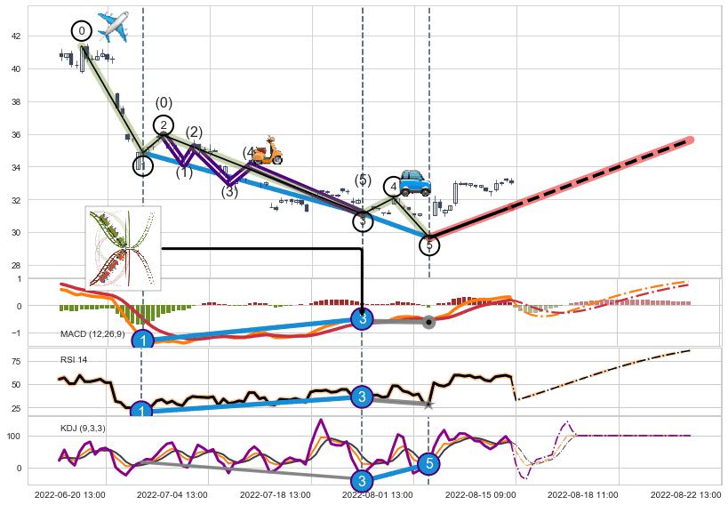 ➢ 1,3,5驱动浪MACD, RSI, KDJ走势都出现【常规背离】反转信号增强