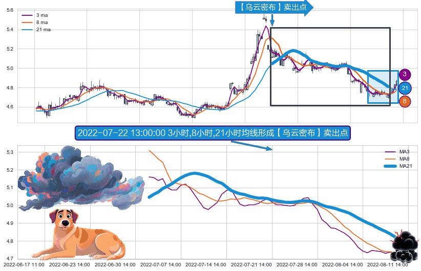 ⚀ 2022-07-04 13:00:00小时-2022-08-10 14:00:00小时显现 3小时-8小时-21小时均线 【乌云密布】卖出点 看空信号,后市看跌,卖出
