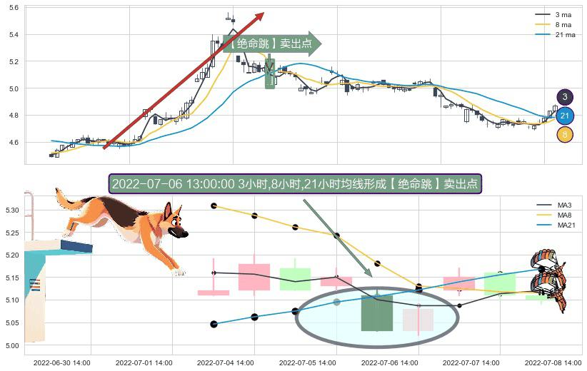 ⚀ 2022-07-06 13:00:00小时显现 3小时-8小时-21小时均线 【绝命跳】卖出点 看空信号,后市看跌,卖出
