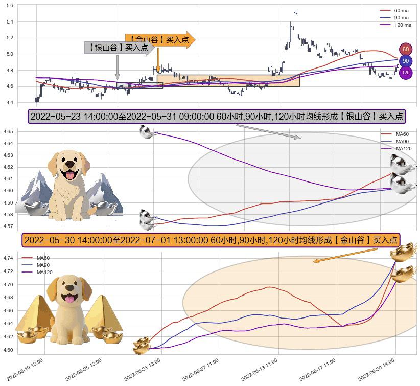 ⚀ 2022-05-31 09:00:00-小时至2022-07-01 13:00:00-小时显现 60小时-90小时-120小时均线 【金山谷】买入点 其再次确认了买入信号,可靠性更强,买入
