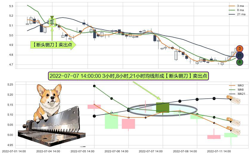 ⚀ 2022-07-07 14:00:00小时显现 3小时-8小时-21小时均线 【断头铡刀】卖出点 看空信号,后市看跌,卖出