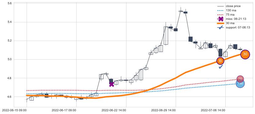 ⚃ 在破位点附近ma依然上升趋势比较明显,平稳迹象是在突破后一段时间后出现,信号【可信度低】