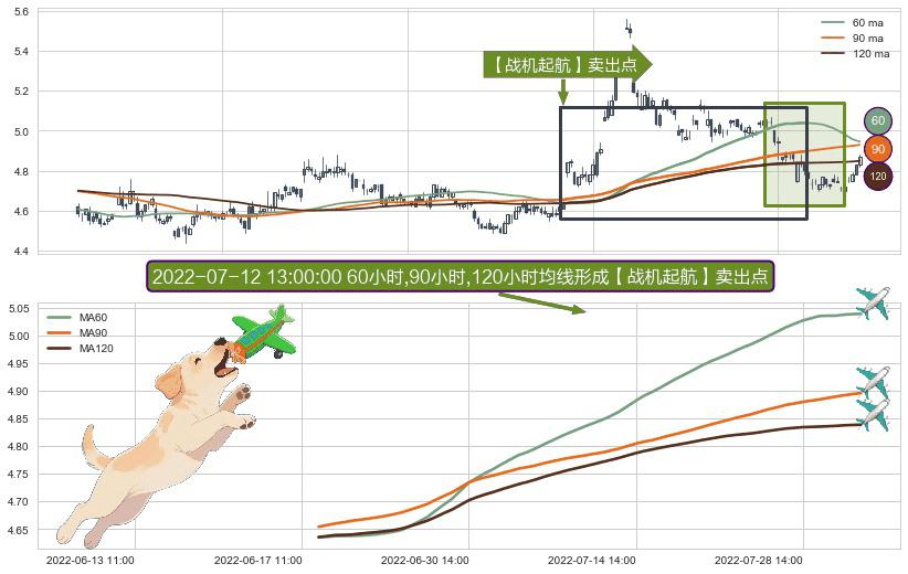⚀ 2022-06-17 14:00:00小时-2022-08-03 13:00:00小时显现 60小时-90小时-120小时均线 【战机起航】卖出点 看空信号,后市看跌,卖出